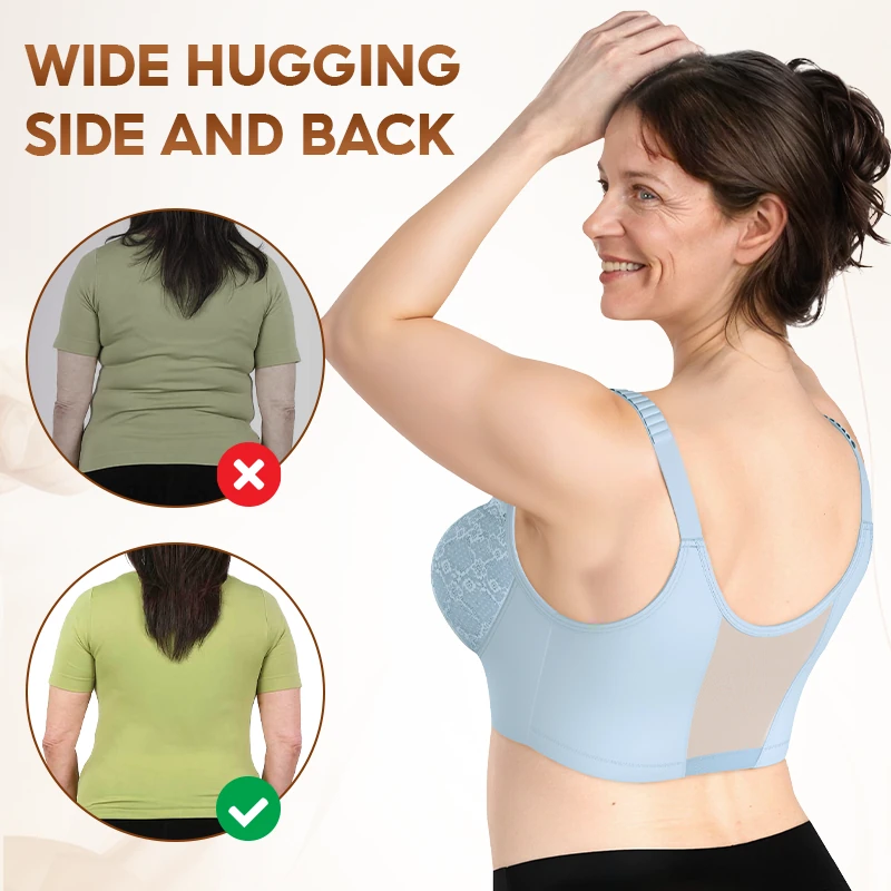 The design of wide side wings, strong shoulder straps, and U-shape back panel ensures maximum support against sagging while smoothing back bulges and correcting armpit fats for a flattering silhouette.